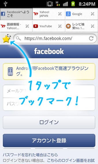 だーぱんブラウザは高速アクセスに加えて使いやすいのも魅力的です。URLバーの左横の星マークをワンタップするだけで簡単にブックマークでき、ホーム画面のブックマークのタブからすぐにお気に入りのウェブサイトにアクセスできます。また、URLバーの右横の「+」マークをタップすると新しいタブを作成でき、最大6つのタブを画面に表示できます。タブをワンタップするだけでサクサク切り替えができるので、スマートフォンのインターネットライフが快適に思えるでしょう。
