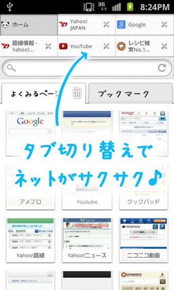 ネットがサクサク♪だーぱんブラウザ(軽量なブラウザーアプリ)(以下、だーぱんブラウザ)は、超便利ミラー(他人から見た自分もみれる鏡アプリ)などでお馴染みのゆるキャラパンダ「だーぱん」の無料インターネットブラウザです。だーぱんの可愛さはもちろん、高速かつ使いやすい機能が満載なので、インターネットをよく使う人には、サクサク for Android、節電♪長持ちバッテリー、容量不足、解消します!とあわせて、ぜひオススメしたいブラウザアプリです。
